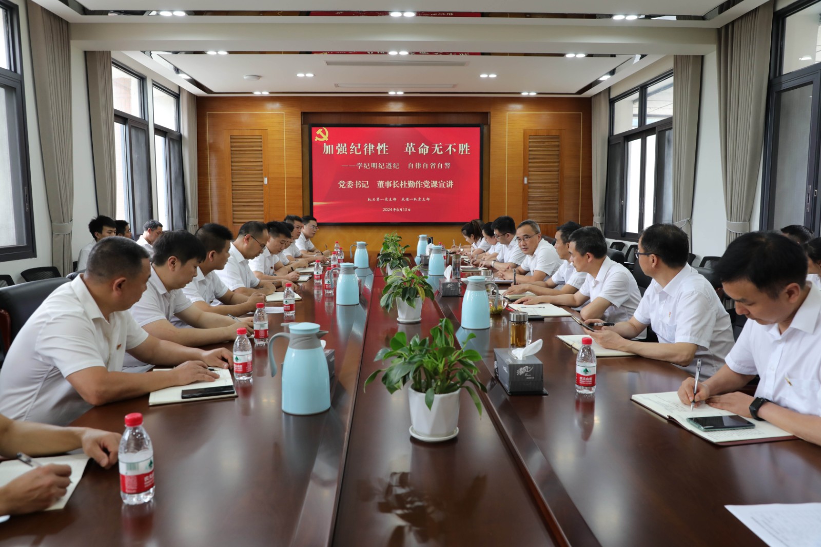 6月13日下午,集团公司党委书记、董事长杜勤作《加强纪律性 革命无不胜》专题党课宣讲,解读新修订的《中国共产党纪律处分条例》,提出纪律要求,机关第一党支部、采一队党支部党员参加学习。